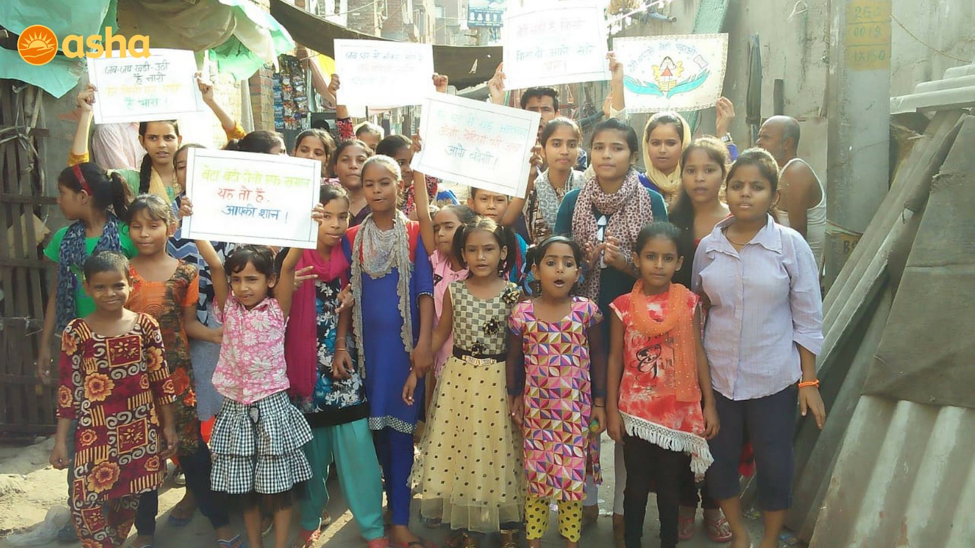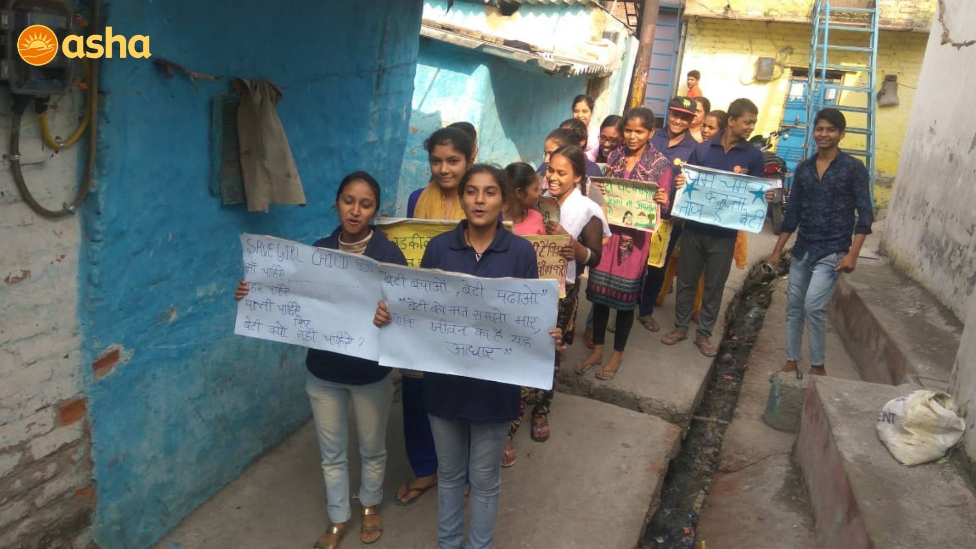 To support the cause and celebrate the birth of girl children, Asha decided to join hands and observe the day in its slums this year. The Asha slum communities had a week-long celebration at their respective centres and conducted multiple performances initiated by the college students, Asha Graduates and Children’s Association (Bal Mandal) members. The performances included street-plays, songs, rallies, self-defence classes and much more. Children along with the help of their seniors made posters, placards and rallied carrying those across the slums to raise public awareness about the female foeticide.