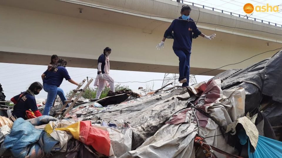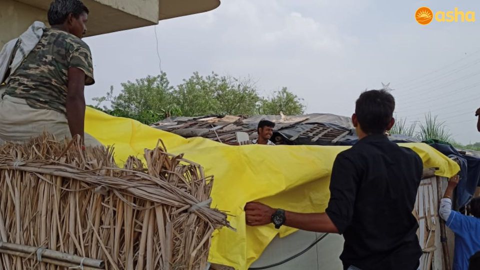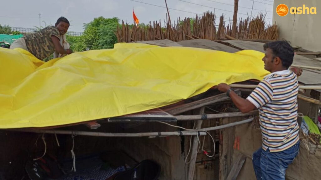 Hi everyone, the flood affected families on the River Bed have no homes, so we are helping them to make temporary structures and covering their roofs with water proof material. The Asha Ambassadors from other communities are doing all this work. It’s quite dangerous trying to lay a roof on a shaky structure. The Ambassadors and Team are brave and committed.