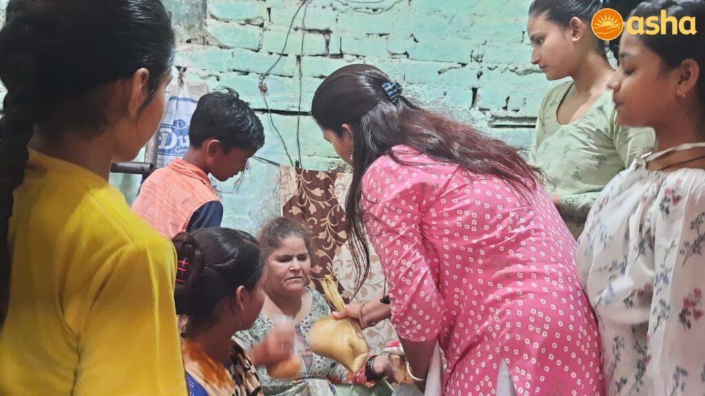 An example of Bal Mandal children collecting their pocket money and buying food for a poor woman whose husband recently passed away. How heart warming to see young children learn these wonderful values.