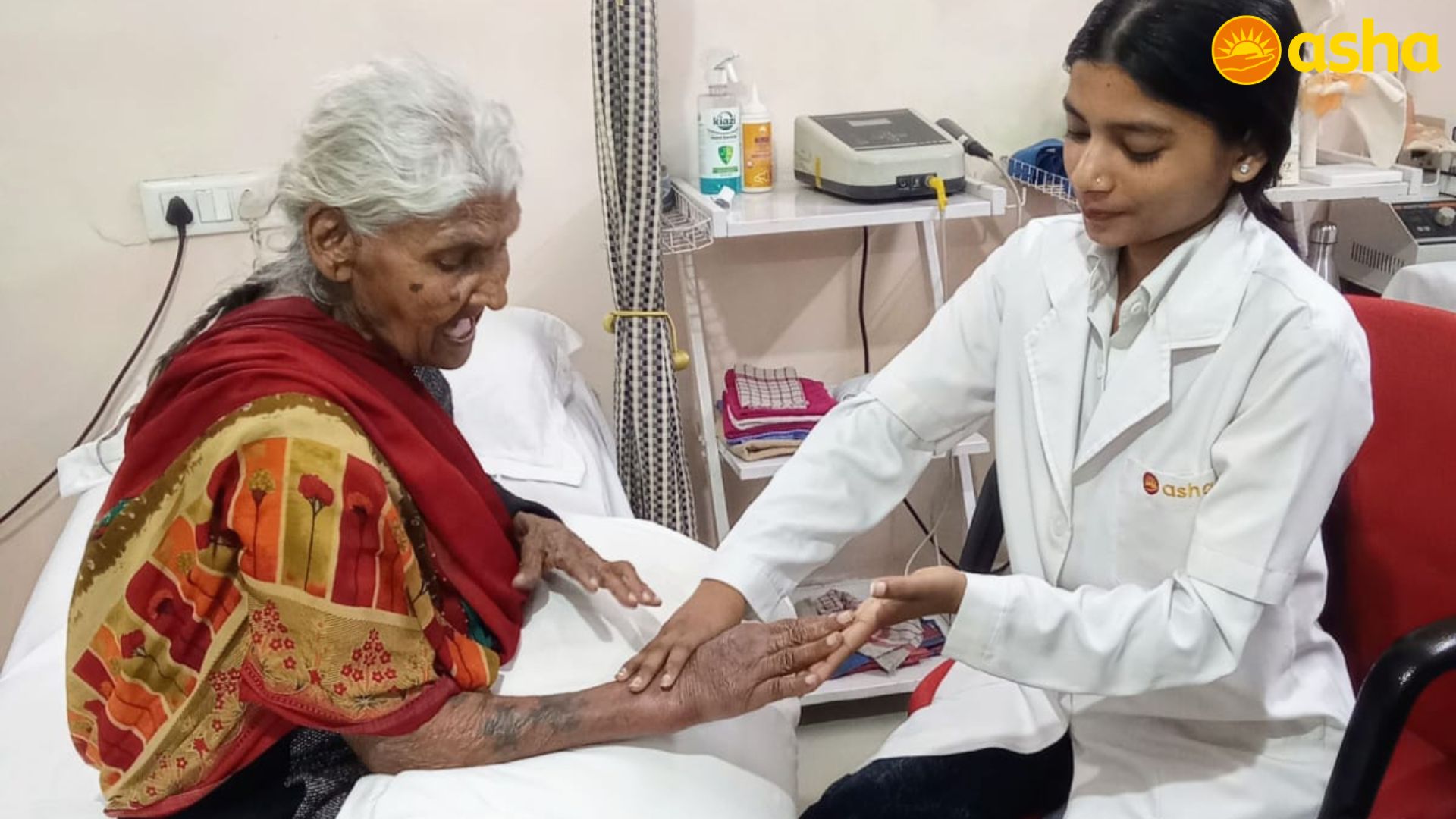 After her hand was plastered at the hospital, the injury healed slowly and swelling remained. She was then referred to the Asha Physiotherapy Clinic, where modern physiotherapy equipment and trained professionals provide treatment free of cost for slum residents.